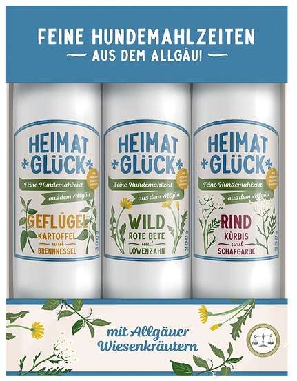 Provate qualcosa di nuovo: Heimatglück Schmankerl Trio contiene una varietà ciascuno di manzo con zucca e achillea (300 g), selvaggina con barbabietola e tarassaco (300 g) e pollame con patate e ortica (300 g). In questo modo potete testare ciò che il vostro cane ama di più oppure offrire ogni giorno una buona variante.