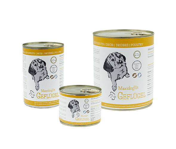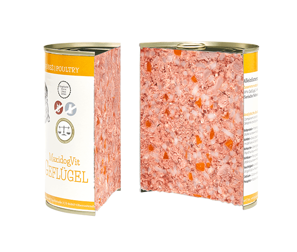 Divorare il cibo è l’attività preferita del vostro cane? Se la risposta è sì, il nostro MaxidogVit Geflügel (Pollame) senza glutine, con carne di pollame altamente digeribile, croccanti carote, gustoso riso e la nostra straordinaria miscela di alghe, che ristabilisce il corretto equilibrio di minerali nell’organismo, è il cibo ideale.
