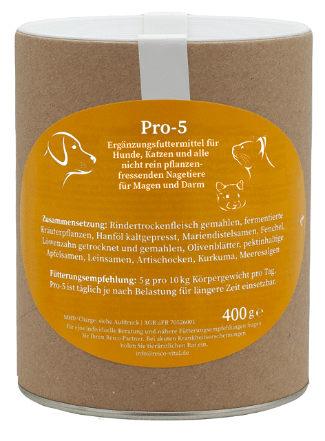 Pro-5 è una miscela di erbe fermentate, colture probiotiche, fibre e stabilizzatori della flora intestinale che viene somministrata per favorire le normali funzioni gastro-intestinali. Pro-5 può esercitare un’azione benefica in caso di disturbi digestivi, flatulenza e altri problemi gastro-intestinali e può essere utilizzato dopo il trattamento con antibiotici, in caso di stress, agitazione o notevole sforzo fisico.